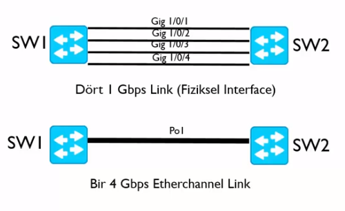 EtherChannel atau sering disebut juga port-channel adalah teknologi link aggregation pada switch cisco yang digunakan untuk mengkombinasikan banyak link fisik menjadi satu link logika untuk meningkatkan throughput dan redundancy apabila sebuah link rusak.