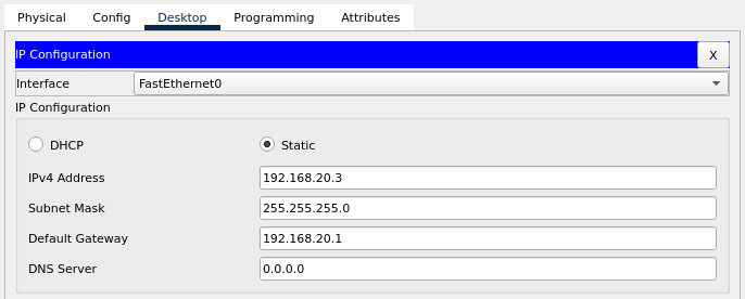 Untuk mengkonfigurasikan IP Address, klik menu Desktop kemudian klik IP Configuration. Konfigurasikan IP Address masing-masing Client sesuai topologi.