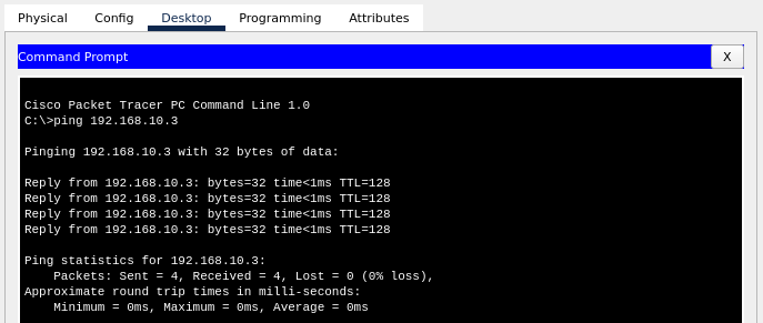 Test ping dari Laptop0 ke Laptop1 (antar VLAN 10):