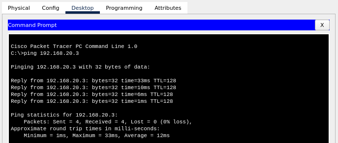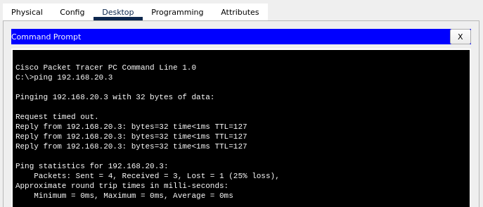 Test ping dari PC0 ke PC1 (antar VLAN 20):