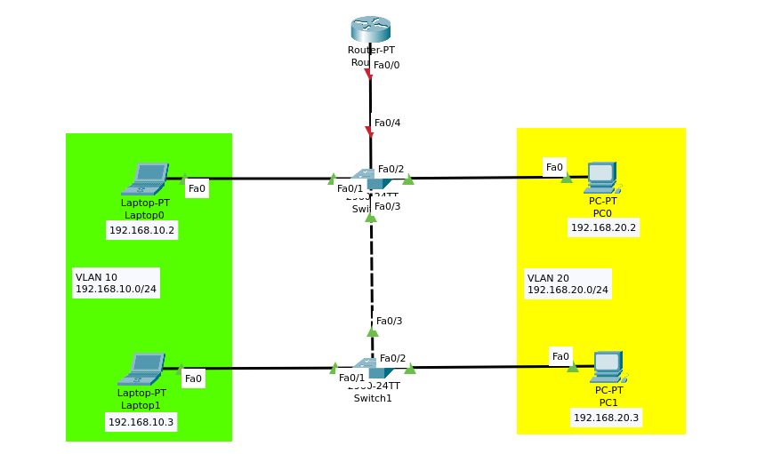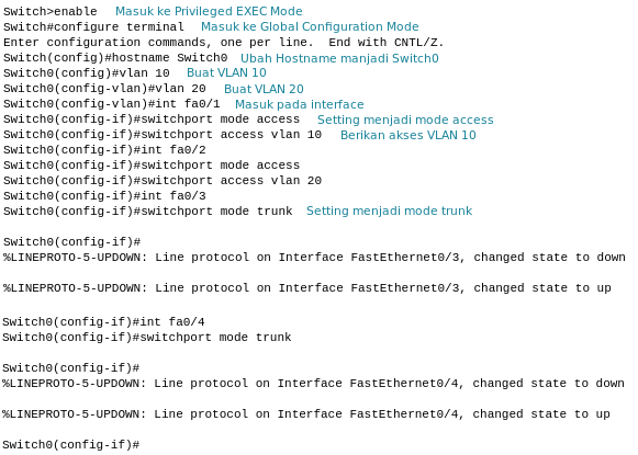 enable configure terminal hostname Switch0 vlan 10 vlan 20 int fa0/1 switchport mode access switchport access vlan 10 int fa0/2 switchport mode access switchport access vlan 20 int fa0/3 switchport mode trunk int fa0/4 switchport mode trunk