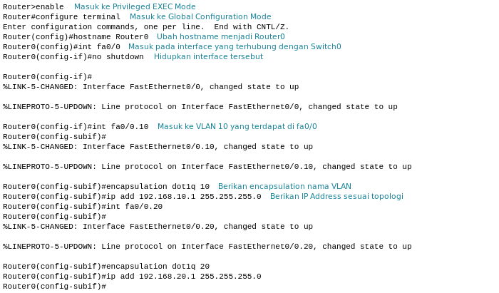 enable configure terminal hostname Router0 int fa0/0 no shutdown int fa0/0.10 encapsulation dot1q 10 ip add 192.168.10.1 255.255.255.0 int fa0/0.20 encapsulation dot1q 20 ip add 192.168.20.1 255.255.255.0