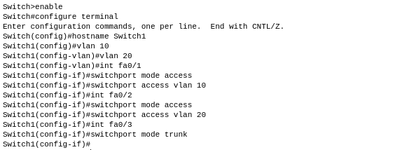 enable configure terminal hostname Switch1 vlan 10 vlan 20 int fa0/1 switchport mode access switchport access vlan 10 int fa0/2 switchport mode access switchport access vlan 20 int fa0/3 switchport mode trunk
